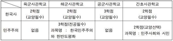 하지만 고대사부터 현대사까지를 한 학기 동안 교육하기에 그 안에서 독립운동사 교육은 턱없이 부족할 수 밖에 없을 것이다. 또한 민주주의 관련 과목은 해군사관학교와 간호사관학교에만 각각 전공필수, 교양선택으로 개설되어 있어 민주주의 관련 과목을 이수하지 않고 졸업하는 생도들도 많음을 알 수 있었다.
