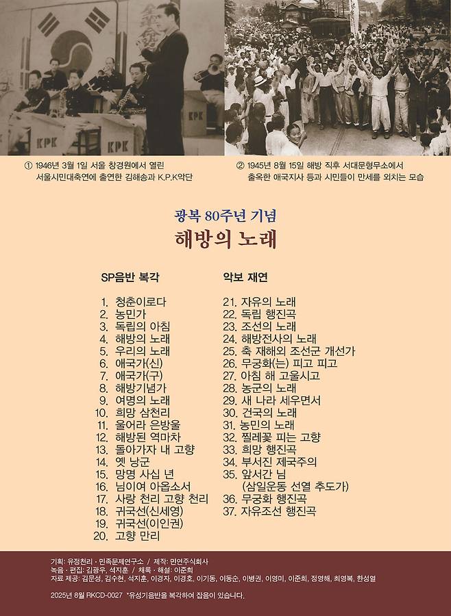 광복 80주년이 되는 올해, 역사적 의미가 남다른 뜻깊은 음반 하나가 제작되었다. 1945년 가을부터 1949년 연말까지 해방 직후 분위기를 담아 만들어진 노래들 중, SP음반으로 발매된 스무 곡과 악보로 남아 있는 열일곱 곡을 한데 모은 CD <해방의 노래>다. 옛가요사랑모임 유정천리와 민족문제연구소가 힘을 모은 두 번째 작품으로, 두 단체는 지난 2017년에 해방 전 군국가요 모음집도 함께 제작한 바 있다.