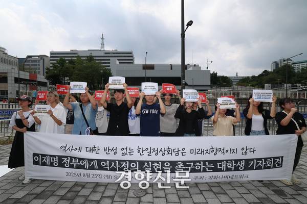 일본군 성노예제 문제 해결을 위한 전국 대학생 연합동아리 ‘평화나비 네트워크’는 25일 오전 서울 용산구 대통령실 앞에서 기자회견을 열고 “이번 한·일정상회담은 사실상 역사 문제를 동결시킨 것”이라며 “식민지·전쟁범죄에 대한 반성과 피해자 존엄 회복의 약속은 빠지고 ‘미래지향’ 같은 추상적 구호만 반복됐다”고 주장했다.