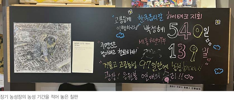 이번 전시에 ‘전시 행동’이라는 이름을 붙인 이유는 이 전시를 통해 광장의 목소리를 더 널리 퍼뜨리는 역할을 박물관이 하겠다는 일종의 선언이었다. 그 선언에 관람객들이 함께해주고 있었다. 박물관에는 그들이 붙인 스티커와 스티커 나눔 공간, 여전히 투쟁하고 있는 농성장을 기억하기 위해 농성 기간을 적어 놓은 칠판이 있다. 박물관은 관람객과 함께 행동하고 있다.