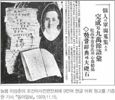 실로 놀라운 보물이올시다. 이것은 이상춘 씨가 온전히 개인의 힘으로 더구나 낮에는 학교 일로 온전히 밤 시간에만 하였다고 합니다. 지금으로부터 7년전 계해(癸亥. 1923년) 정월부터 착수하였고 이 속에 모인 말수가 9만 어휘가 넘으므로 총독부에서 10여 인이 11년간에 만든 『조선어사전』(1920)이 겨우 5만여 어휘에 불과합니다. 내용도 얼마나 충실한지 씨의 노력을 상상할 수 있습니다. 이와 같이 다소 수정만 가하면 씨 개인의 사업으로 완전한 사전 하나를 인쇄할 수 있는 원고임에도 불구하고 통일적 사전 하나를 위하여 그처럼 대성한 원고를 우리에게 아무런 보수도 없이 내어놓는 것을 우리 간부들은 눈물겨워 감사할 뿐 아니라 앞으로 우리의 노력을 기울여 완성할 즐거움이 있습니다.(『중외일보』 1929.11.15)