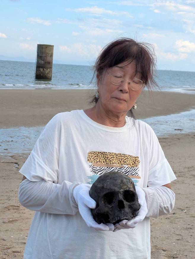 우에다 게이시 ‘새기는 모임’ 사무국장(우에다): 지난해 11월과 올해 2·4·6·8월 다섯 번 잠수 조사를 하고서 여섯 번째 조사를 하던 8월25일 처음 유골 세 점을 발견했다. 원래 다음 날인 8월26일의 계획은 전날 잠수 조사에서 발견된, 장화를 신은 채 누워 있는 듯한 모습의 유골(다리뼈)을 건져 올리는 것이었다. 그런데 잠수 조사에 참여한 한국인 다이버 김경수·김수은씨가 두개골을 갖고 나왔다. 우리의 기대를 뛰어넘은 거다. 그런 결단을 내린 데에는 역시 민족적인 마음이 작용하지 않았을까. 처음 유골이 나왔을 때 X(옛 트위터)에서 넷 우익들이 ‘유골을 구경거리로 삼는 것 아니냐’고 비판했는데, 〈마이니치신문〉이 1면에 두개골 사진을 실은 이후로는 그런 비판이 쏙 들어갔다.