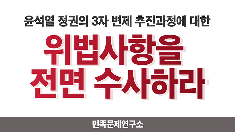 역사정의 실현과 강제동원 피해자의 인권 회복을 위해 노력해온 민족문제연구소는 어떠한 정당성도 없는 제3자 변제를 강제한 윤석열 정권의 위법행위를 결코 좌시할 수 없다. 보도에서 드러난 바와 같이 우리는 제3자 변제 졸속 추진 과정 전체에 걸친 대통령실의 부당한 개입과 외교부, 일제강제동원피해자지원재단 등 관계자 전원에 대한 경찰의 전면적이고 성역 없는 수사를 강력히 촉구한다.