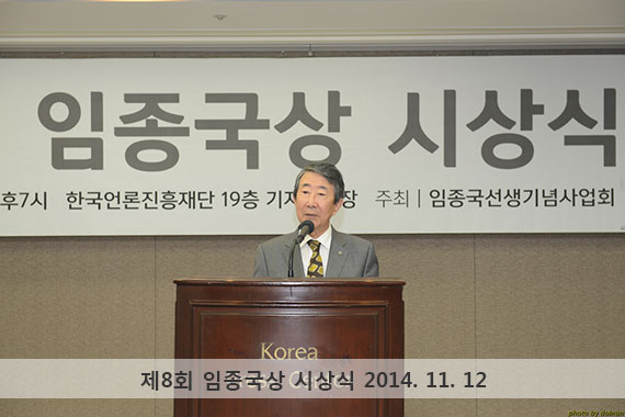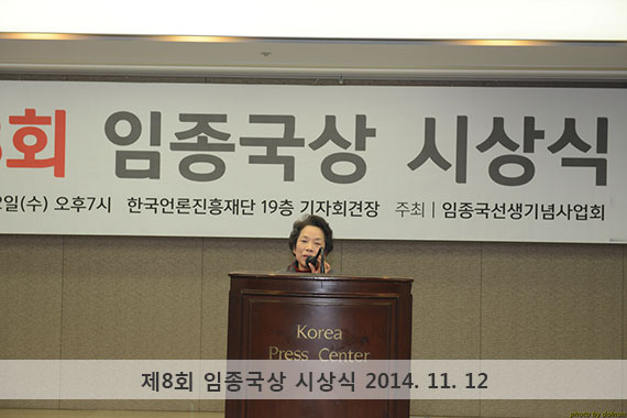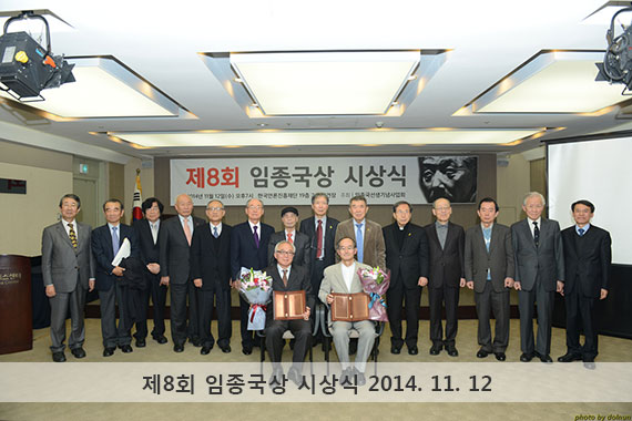 지난 2014년 11월 12일(수) 오후 7시 한국언론진흥재단 19층 기자회견장에서 회원 및 각계 인사 120여 명이 참석한 가운데 제8회 임종국상 시상식이 열렸다. 학술 부문에 김효순 포럼 ‘진실과 정의’ 공동대표가, 사회 부문에는 일본의 시민단체 ‘강제동원진상규명네트워크’ 단체로 히다 유이치 공동대표가 수상하였다. ‘친일청산’, ‘역사정의 실현’, ‘민족사 정립’이라는 임종국 선생의 뜻과 실천적 삶을 기리며 오늘의 현실 속에서 올바르게 계승 실천하신 수상자분들과 함께 뜻깊은 자리를 가졌다. |