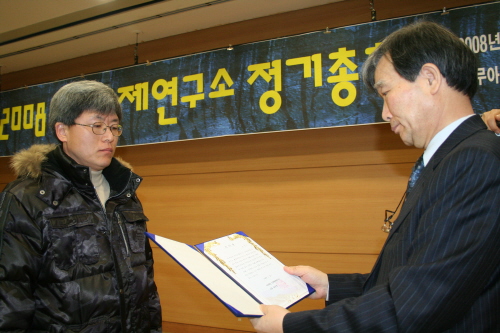 ▲ 서용희 회원을 대신해서 공로패를 받고 있는 이호헌 경기남부지부장(오른쪽)