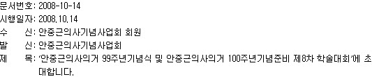 알림 ‘안중근의사의거 99주년기념식 및 안중근의사의거 100주년기념준비 제8차 학 술대회’에 초대합니다. By 민족문제연구소 - 2008년 10월 15일 781 주소:서울 동대문구 제기2동 148-115 안암빌딩4층Tel:02)928-7631 Fax:02)706-9020 http://www.greatkorean.org 1. 귀하의 무궁한 발전을 기원합니다. 2. 안중근의사 기념사업회는 2008년 10월 24일(금)에 “안중근의사의거 99주년 기념식 및 제8차 학술대회”를 개최합니다. 3. 많은 관심과 참석 부탁드립니다. – 내 용 – – 일시 : 2008년 10월24일(금) 13:00~18;30 – 장소 : 한국외국어대학교 법학관 101호 – 주최 : 한국정치학회, (사)기쁨과희망사목원구원, 안중근의사기념사업회 – 후원 : 국가보훈처 * 첨부 : 초청장 04657296.jpg (161.36 KB) NO COMMENTS 소식 알림 성명논평 보도자료 주요기사 지부활동 화보 9,969