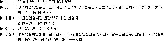 경술국치 100주년을 맞는 2010년 삼일절에 항일독립운동의 유서가 깊은 광주제일고등학교의 교정에 자리잡고 있는 광주학생독립운동기념역사관과 광주학생독립운동기념탑에서 시민보고회와 헌정식을 갖고자 하니 바쁘시더라도 부디 참석하시어, 민족사의 정의를 실현하는 길에 함께 해주시기를 바랍니다. |
