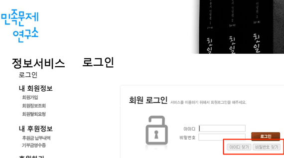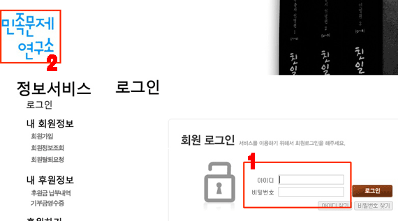 – 로그인 이후 왼쪽 상단 ‘민족문제연구소’ 로고를 클릭하여 연구소 홈페이지로 이동