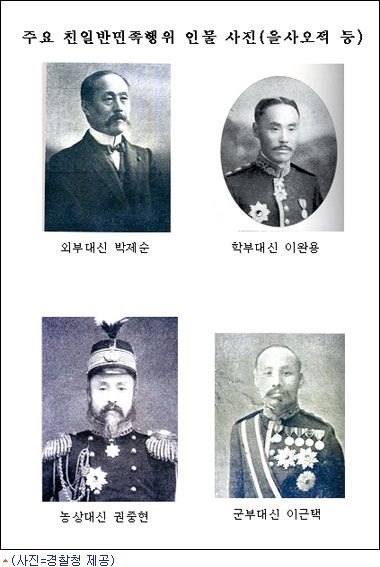 우선 적극적 매국행위를 했던 이완용과 조선총독부 자문기관인 중추원 부찬의를 지낸 오제영, 의병탄압에 적극 앞장섰던 경찰 최진태, 동양척식회사 설립위원으로서 일제의 경제침탈에 적극 협력했던 백완혁이 포함돼 있다.