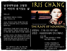영화 내용 북미에서 아이리스 창은 탁월한 재능의 저술가였으며 인권과 정의를 추구하는 선구자로 널리 알려져있고 특히 많은 중국인들에게는 영웅으로 여겨지는 인물이다. 그녀의 전설적이고 탁월한 작품은 많은 사람들의 삶에 큰 영향을 미쳤는데 이 영화는자신의 권리를 찾지 못하는 약자들의 대변인으로 산 아이리스의 삶과 용기를 잘 표현하고 있을 뿐 아니라 70년전에 일어났던 대 학살의 역사적 측면을 사실적으로 깊게 담고 있다. 이 작품을 통해 많은 사람들에게 오래동안 궁금했던 많은 질문에 확실한 답변을 얻을 수 있고 역사의 정확한 근거를 제시함으로서 서양세계에는 오래동안 알려지지 않았던 역사적 증거를 찾아볼 수있다. 남경 대학살 70주년을 맞아 제작된 이 영화는 아이리스 창의 용감하고 진취적 삶의 이야기를 통해 세계의 암흑속에 오래 묻혀져있던 역사의 진실을 밝히고 젊은 여성의 확신과 용기가 어두운 과거에 한 줄기 희망의 빛을 던져 줌을 상기시켜주고 있다. 이 영화는 아이리스가 고등학교 학생들 앞에서 한 연설을 끝으로 종결을 짓는데 이 연설은 젊은 세대들이 이 세상을 좀 더 좋은 세상으로 만들수 있는 무한한 꿈과 힘을 가지고 있다는 희망을 보여주는 강력하고 감동적인 연설이다. 영화의 배경 자료연구와 생존자들의 기록 토론토 알파는 아이리스에 관한 관련자료를 얻는데 아이리스의 부모님들의 큰 도움을 얻었다. 딕비 쿡을 팀장으로 각 영역의 전문가들이 일년여간 관련된 자료에대한 심도있는 연구를 하였고 아이리스의 지인들의 도움을 받아 남경 대학살과 아이리스에 관한 자료를 모으기 시작하였다. 그 결과 후버 연구소에 소장되어 있던 아이리스의 연구자료 200여개의 상자를 찾아내고 아이리스가 생전에 남경의 생존자들을 만나 직접 인터뷰 했던 비디오를 찾아내었을 뿐 만 아니라 존 라베의 아들 데이비드 메기로 부터 1937년 당시의 학살내용이 담긴 원본 필름또한 확보할 수 있었다. 이 연구팀은 수 많은 생존자들을 찾아내어 인터뷰를 시작하였는데 이들 생존자들의 대부분은 상당히 노약한 상태로 학살이 일어났던 같은 마을 그들의 생활터전에서 열악한 상태로 살아가고 있었다. 연구팀들은 아이리스가 10년전에 인터뷰한 같은 생존자들을 인터뷰 할 수 있는 것을 무척 행운으로 여겼고 진행되는 인터뷰들은 상당히 가슴을 울리는 이야기들이 많아 인터뷰 종종 눈물바다가 되곤 하였다. 이렇게 가슴을 울린 이야기들은 팀원들에게 이들의 이야기를 더 많이 세상에 알려야 하겠다는 확신을 더욱 확고히 해주었고 아이리스가 남경에 머물렀을때 도움을 준 교수들과 남경 대학살 기념관의 관장 등 4명의 전문가들도 만나보았다. 영화제작 제작팀은 12월 13일에 있었던 남경 대학살 기념식을 직접 접하고 이를 기록으로 남길 수 있는 기회가 있었는데 이 기념식에는 수 천명의 남경 시민들과 대부분의 생존자와 희생자 가족들이 참석을 했다. 이 영화 속에는 아이리스 주변의 인물들, 부모님, 친구들, 남편과 동료 등 평상시에 아이리스를 잘 알고 지냈던 사람들과의 인터뷰가 담겨있는데 이들을 통해 아이리스의 삶을 조명해 볼 수 있다. 바바라 메신은 아이리스의 가장 친한 친구였고 수잔 라비너는 아이리스가 이 책을 출간할 수 있도록 힘을 불어넣어준 친구이자 출판관계자 있다. 이 밖에 “황제의 이름으로”책을 공공저술한 낸시 통, 아이리스의 정신적 지주였던 분, 바탕 전쟁의 용사들, 글로벌 얼라이언스의 주요멤버들, 아이리스와 그녀의 책을 캐나다 미디어에 알리는 일에 기여한 캐나다 알파의 공동회장 등의 인터뷰가 실려있다. 올리비아는 아이리스와 신체적으로 닯았을 뿐 아니라 본인이 이 영화 제작에 대해 전혀 모르고 있을 때부터 이미 아이리스에 관한 연구를 하고 있었기에 아이리스의 감정적 교감이 쉽게 이루어졌고 여러가지 조건으로 아이리스 창의 역을 맏기에 너무나 적합한 인물이었다. 2007년 3월에 아이리스 역할을 맏았던 올리비아 청을 아이리스의 깊은 흔적이 남아있는 남경으로 데리고 가서 촬영을 시작했다. 제작팀은 일본으로도 건너가 그곳의 교수들, 일본 기자들, 일본의 전쟁 참전자들을 인터뷰 했고 참혹한 역사에 대해 적극 부인하거나 너무나 이해 할 수 없는 의견들을 제시하는 민족주의자들 또한 인터뷰를 하였다. 일본에서 평화를 위해 싸우는 액티비스트와의 인터뷰도 생생히 담겨져 있는데 아이리스의 이야기를 통해 아주마라는 일본의 병사가 공개적으로 그들의 전쟁 범죄사실을 실토하는 장면도 있다. 주제가 아이리스의 삶에 크게 감동한 올리비아 청이 적은 시에 요요삼이 곡을 만들었다. 아이리스는 남경에서 아이리스의 역을 촬영한 후 그의 감정을 시로 표시했고 역사에 대해서는 거의 몰랐던 요요삼은 이 시에 감명을 받아 작곡을 하였다. 요요의 아름다운 목소리로 불려지는 이 주제가는 많은 사람들의 심금을 울렸고 특히 영화의 끝에 불려지는 이 노래는 이 영화를 보는이의 감정을 극도로 고조시킨다. 주제가는 중국어, 한국어와 일어로 쓰여졌고 이 영화를 위한 음향은 중국의 악기연주 음향효과에 익숙