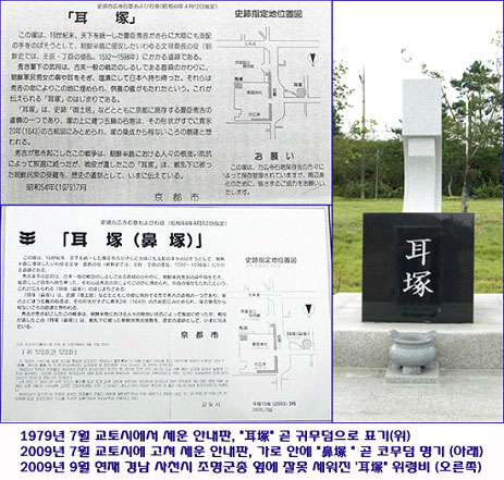 그러나 이 학술토론회 이전에도 메이지 시대에 이미 도쿄대학 호시노 박사가 그의 논문에서 『교토 코무덤은 귀무덤이 아니라 코무덤이다』라고 명확히 밝혔으며 나카오 히로시 씨 역시 코무덤의 결정적인 1급 사료인 깃가와가 문서(吉川家文書)와 나베지마가 문서(鍋島家文書)에서 코영수증은 있어도 귀영수증은 없다며 코무덤임을 단정하고 있다. 또 결정적인 증거는 교토시에서 세운 코무덤 안내판이다. | ||||||||||||||||||