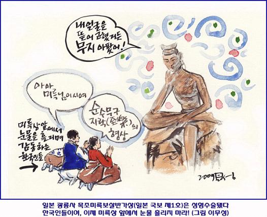 황수영 씨 책에서 달랑 1쪽을 할애한 ‘미륵상’ 사진에 대한 의문을 짚어보자. 1) 언제 찍은 사진인가? 이러한 부분에 대한 전문가의 설명이 제대로 이뤄지지 않고 있음은 심히 유감이다. 얼굴은 이미 갈아 치운 지 100여 년이 지났다. 그리고 이 미륵상에 대한 올바른 정보를 가진 한국인들도 거의 없다. 그를 반증하듯 오늘도 인터넷에는 “신비하고 아름다운 형언할 수 없는 얼굴의 미륵상”이라고 표현한 글들이 확대, 재생산되고 있다. 일본인의 모습으로 바꿔놓은 미륵상 앞에서 감탄하는 것은 바보들의 합창일 뿐이다. 이런 일을 하고도 광륭사가 책자나 누리집에도 알리지 않은 채 버젓이 입장 수입을 챙기는 현실 또한 지적해야 한다. 일본은 광개토대왕비문과 칠지도 위변조 사건을 비롯하여 일본열도를 떠들썩하게 했던 2000년 구석기시대 날조극 등을 통해 세상으로부터 대망신을 당했다. 역시 같은 맥락이 아닐까? 일본 국보 1호 미륵상 얼굴을 뜯어고치고 현재까지도 광륭사 측이 입을 싹 씻는 점은 가히 충격적이다. 이 미륵상을 보고 간 수많은 한국인! 그들의 마음속에 남아 있는 미륵상은 고대 한반도 장인이 만든 얼굴이 아니다. 일본인에게 사랑받으려고 개조된 인형의 모습이다. “수리 전의 얼굴모습은 한국인 모습이었다”라고 신이치 교수는 증언하고 있지 않은가! 투박하지만 순박한 모습의 미륵상이 한국인의 얼굴이다. 날렵한 일본인의 얼굴로 뜯어고쳐 놓은 지금의 미륵상은 인공이 가미된 미륵상이요, 세기적 보물에 손을 댄 파렴치한의 소행이다. 문화유산은 어떠한 경우든 원형을 그대로 보존해야 하며 손상 시에는 가능한 한 원형복구가 이뤄져야 함은 상식이다. 그리고 복원을 하더라도 언제 누구에 의해 어떻게 복원되었다는 것을 밝혀야 하는 것 역시 상식이다. 대영제국 박물관이 소장한 수많은 나라의 문화재를 함부로 뜯어고치고도 입을 싹 씻었다는 이야기는 들어 본 적이 없다. 일본인의 국보의식의 한계를 엿보게 해준다. 광륭사는 미륵상 얼굴을 뜯어고친 것이 두려운 듯 주소나 전화번호도 없이 야스퍼스가 극찬한 글과 일본 국보 제1호란 것만 강조하는 이상한 안내 책자를 팔고 있다. 그뿐만 아니라 누리집에도 소상한 내용을 싣지않고 있다. 어떠한 경위로 고대 한반도인이 만든 찬란한 작품이 일본 땅에 안치된 것인지 조사하여 그 고향으로 되돌려주지는 못할망정 작품에 함부로 손을 대고 뜯어고치고도 숨기는 광륭사와 이러한 사실을 안 학자들, 전문가들, 언론들, 문화재 관계자들은 지금이라도 그 경위를 한국에 소상히 밝혀야 할 것이다. 그래서 인공적으로 바뀐 훼손된 불상 앞에서 흘리는 눈물을 거두게 하고 진정으로 불쌍한 미륵상을 위한 눈물을 흘리게 해야만 한다. |