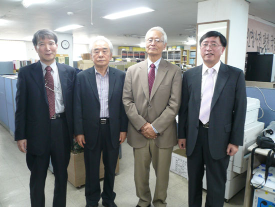 허도성 회원은 귀국에 앞서 연구소에 보낸 편지에서 “고대하던 친일인명사전이 곧 출간될 것이라 하니 크게 기쁘고 감개가 무량합니다. 러시아와 북만주에 흩어져있는 저의 사촌들이 3대째 한의 눈물을 흘렸는데 이 책이 있어 한의 눈물을 닦아 줍니다”라고 말했다. (왼쪽부터 임헌영 소장, 최염 지도위원, 허도성 회원, 조세열 사무총장) |