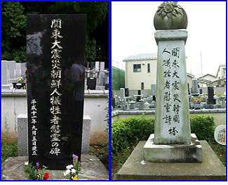 도쿄도 스미다구 야히로 6번지(墨田區 八廣6-31-8)에는 ‘관동대지진 한국 ·조선인 순직자 추도비’가 세워져 있다. 여기서 먼저 한국인이면 한국이고 조선인이면 조선인이지 <한국·조선인>이란 표현이 무슨 말인가 싶을 독자를 위해 한 가지 설명해둘 것이 있다. 다름 아닌 추도비문 이름이다. 2003년 9월 현재 도쿄 전역에는 21곳에 위령비가 세워져 있으나 추도비 이름은 제각각이다. 그 까닭은 1923년 9월 1일 관동대지진 당시 ‘조선’이던 나라가 6·25 한국전쟁으로 남과 북이 갈라져 한 곳은 남한 곧 ‘대한민국’이요, 한 곳은 북한 곧 ‘조선민주주의인민공화국’으로 된 때문이다. 일본인들에겐 ‘조선인=북한’, ‘한국인=남한’ 의식이 강한데다가 재일동포들 역시 추도비나 위령탑을 세우려다 보니 주체의식에 대한 혼란이 생겨 ‘한국인 추도비’, ‘조선인 추도비’, ‘무연불(無緣佛) 공양탑’, ‘이국인(異國人) 위령탑’, ‘동포 희생탑’ 등 통일되지 못한 이름으로 불리게 된 것이다. 분단의 아픈 상처가 위령비에도 나타나있다. | |||