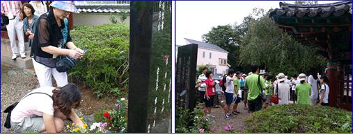 팔월 한낮의 뜨거운 햇볕 속에서 답사단을 아라카와 강변으로 안내해준 사람은 전직 교사출신 니시자키(西崎雅夫方) 씨로 그는 사회교육단체 <그룹 봉선화>를 이끄는 대표였다. 봉선화모임은 이곳에 추도비를 세우려고 1975년부터 ‘조선인 학살사건’을 연구해온 모임이다. 이들은 1982년 7월 ‘관동대지진에 학살된 조선인 유골을 발굴하여 추모하는 모임’을 결성하여 학살에 대한 증언자 150명을 확보한 이래 1992년에는 ≪바람이여 봉선화 노래를 전해다오, 風、鳳仙花の歌をはこべ≫라는 책을 발간하는 등 아라카와 학살현장을 보존하고 일본에 알리기 위한 운동을 하는 순수한 일본인 단체이다. 그들은 34년간 준비 끝에 2009년 9월 5일 추도비 건립을 보게 되었다. 십시일반으로 사유지를 사들여서 과거 일본정부에 의해 저질러진 학살의 역사를 기록하는 한편 매년 억울하게 죽은 이들을 위한 추모집회를 여는 등 이들의 활동에 답사단의 고개가 저절로 숙여졌다. 니시자키 씨는 추도비가 들어섰다고 해서 일이 끝난 것이 아니라 봉선화 모임은 앞으로 희생자추모사업을 법인화하여 오래도록 학살관계 일을 할 것이라고 다짐했다. 또 니시자키 씨는 학교도 그만두고 이 일에 매달리고 있으며, 혹시나 세워둔 추도비를 우익들이 훼손할까 봐 추도비 옆에 집을 구해 지키고 있었다. 무엇이 그를 이렇게 남의 나라 희생자들을 위해 헌신하게 하였을까? 일본정부의 무관심과 어려운 주머니 사정에도 회비를 모으고 마음을 모아 학살된 조선인을 위한 열정을 다 바치는 분들을 곳곳에서 만날 때마다 가슴이 뭉클해진다. 왠지 따뜻해짐을 느낀다. 추도비와 아라카와 학살현장을 둘러보고 돌아오는 길에 니시자키 씨는 답사단에게 봉선화 씨앗이 든 작은 봉투를 선물했다. 내년에는 울 밑에 심어 고운 싹을 틔우리라는 다짐을 했다. 한편으로는 어떻게든지 한국인들도 이들과 동참해야 하지 않을까 하는 안타까운 마음으로 답사단이 이어서 찾은 곳은 치바현 관음사였다. 3) 치바현 나기하라마을에 묻힌 조선인 학살현장에서 “흰 목련꽃 나무 아래 / 나란히 누워 잠든 그대들 누구인가! / 고향땅 어머니 곁 떠나 / 어이타 황천길 들었는가! / 오다케 할머니는 힘주어 들려주셨지 / 목련꽃 나무뿌리 밑에 조선인 시신 6구가 뒤엉켜 있더라 / 그때 / 매미는 고래고래 악을 썼고 / 목련꽃 나무 옆 주택가 하늘은 흐려있었지 / 꽃은 지고 또 피고 또 피고 또 지고… / 뉘 집 귀한 아들이었을까? / 학살된 젊은 조선인을 그리며 관음사로 돌아오는 길 / 팔월 무더위는 끝내 / 속적삼을 적시었지” -고야, 흰 목련꽃 나무 밑(치바현 나기하라 조선인 학살 현장의 오다케 할머니)- 스미다구 아라카와 강가의 학살 현장을 벗어나 치바현 관음사에 도착한 것은 오후 3시 반. 날씨는 더웠지만 맑았다. 한국보다 심한 습기와 불볕더위로 냉방 잘된 버스에서 내리자 훅 하고 불어오는 더운 바람에 숨이 턱 막힌다. 이렇게 더운 날씨에도 답사단이 도착하는 곳에는 반드시 서너 명씩 현지 사정에 밝은 시민단체 회원들이 나와 주었다. 관음사 앞마당에 버스를 세우고 내리니 남산 식물원에서 보던 커다란 선인장이 우리를 반긴다. 잘도 키워 꽃을 피운 선인장 앞에서 우리를 실은 버스가 도착할 때까지 더위를 무릅쓰고 기다려준 사람들은 ‘치바현에 있어서의 관동대진재와 조선인 희생자 추도 조사실행 위원회’ 히라가타 사무국장, 오다케요네코 씨 등 시민단체 회원들이었다. 반갑게 우리를 안내하는 이들이 한없이 고마웠다. | |||