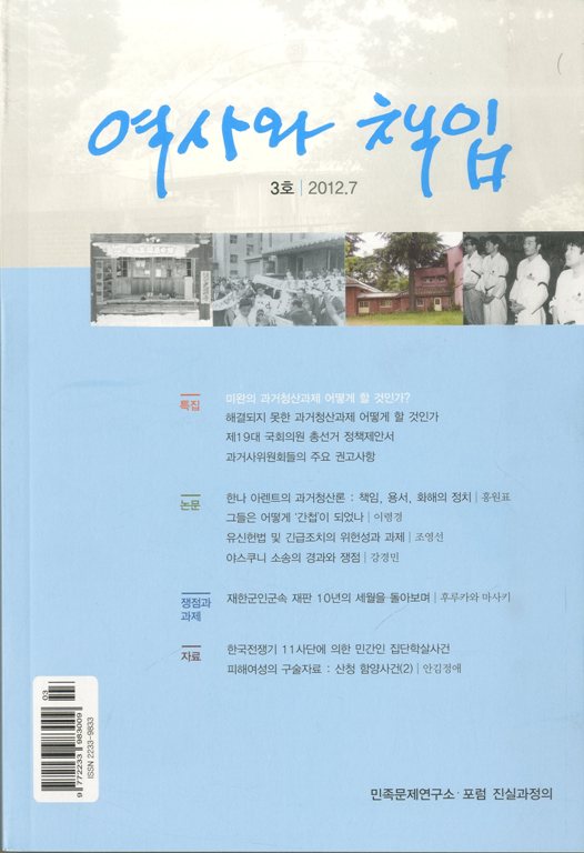 역사와 책임”3호”가 발간되었다. 이번 호에서는 <특집>으로 아직까지 해결하지 못한 과거청산의 과제를 어떻게 할 것인가에 대해 실천적이고 구체적인 해결 방안을 모색하는 난을 마련했다. 노무현 정권 때 집중적으로 설립되었던 과거사 위원회들이 달성한 성과와 한계, 과제 등을 다룬 평가회는 여러 차례 있었다. 그간의 평가회에서 많은 이야기들은 오갔지만, 정작 남은 과제가 무엇이고, 그것을 어떻게 해결해나갈 것인가에 대한 토론은 부족했다고 할 수 있다. 부족했던 이유는 여러 가지로 설명될 수 있을 것이다.