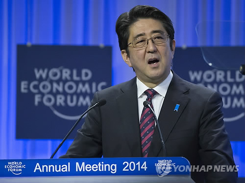 전쟁 ‘안한다’고 했잖아요 (AP=연합뉴스) 22일(현지시간) 스위스 다보스의 제44차 세계경제포럼(WEF, 일명 다보스포럼) 연차총회 개막식에서 아베 신조(安倍晋三) 일본 총리가 연설하고 있다. 아베 총리는 이날 각국 언론사 간부들과 만난 자리에서 한국과 중국이 강력히 반발하는 신사 참배를 강행한 이유를 묻는 질문에 “추도 대상은 일본 군인들뿐 아니라 세계의 모든 전쟁 희생자들”이라며 “일본은 다시는 전쟁을 하지 않겠다고 약속했고 세계 평화를 희망하기 때문에 앞으로도 계속될 것”이라고 주장했다. bulls@yna.co.kr 다보스포럼서 언론사 간부들에 발언…FT논설위원 “가장 고약한 경험”(다보스·도쿄·서울=연합뉴스) 류현성 조준형 특파원 김효정 기자 = 아베 신조(安倍晋三) 일본 총리가 중국과 일본의 현 긴장 상태를 1차 세계대전이 발발하기 전 영국과 독일의 상황과 비교하면서 ‘우발적 충돌’ 가능성을 언급했다. 영국 일간 파이낸셜타임스(FT) 등은 아베 총리가 22일(현지시간) 스위스 다보스에서 열린 제44차 세계경제포럼(WEF, 일명 다보스포럼) 연차총회에서 각국 언론사 간부들과 만나 이같이 말했다고 보도했다. FT에 따르면 아베 총리는 1914년 당시 경쟁 관계이던 영국과 독일이 중국·일본처럼 매우 강력한 교역관계를 맺고 있었지만, 이것이 충돌을 막지는 못했다며 ‘비슷한 상황’이라고 설명했다. 그러면서 아베 총리는 어떤 종류의 ‘경솔한’ 충돌도 재앙으로 간주한다는 점을 명확히 했다고 FT는 덧붙였다. 아베 총리는 이 자리에서 “우발적인 수준에서나 부주의한 방식으로 갑자기 충돌이나 분쟁이 발생할 수 있다”는 발언도 했다고 미국 시사주간지 타임은 전했다. 그는 “불행히도 우리에겐 분명하고 명시적인 로드맵이 없다”며 중일 간 ‘군사 대 군사’ 소통채널을 개설하는 방안을 거론했다고 외신들은 보도했다. 아베 총리의 발언에 대해 다보스 포럼을 취재 중인 마틴 울프 FT 수석 논설위원은 FT 홈페이지에 실린 동영상 취재담에서 “그는 질의응답 때 분명히 중국과의 충돌 가능성을 배제하지 않았다”며 “다보스 포럼에서 여러 해 사이에 겪은 가장 고약한 경험이었다”고 말했다.
