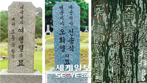 세계일보가 서울 국립현충원 애국지사 묘비를 확인한 결과 곳곳에서 오류가 발견됐다. 애국지사 고 여행열씨의 묘비는 공훈록과 달리 이름 끝자가 ‘렬’로 표기돼 있고, 애국지사 고 신송식씨의 묘비에는 가족 ‘오희영’씨 이름이 올라 있었다. 유족들은 오씨가 애국지라고 밝혔지만 현충원 공훈록에는 누락돼 있었다. 애국지사 고 이민화씨 묘비에는 건국훈장 독립장 추서 연도 끝자리가 누락된 채 한자로 ‘196’(왼쪽 상단 원 부분)이라고 쓰여 있었다.(왼쪽 사진부터) 정선형 기자