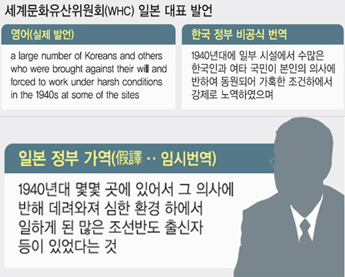 조선인 강제노동 시설의 세계문화유산 등재를 둘러싼 갈등의 핵심은 5일 세계문화유산위원회(WHC)에서 일본 정부 대표인 사토 구니(佐藤地) 주(駐) 유네스코 일본 대사가 영어로 발언한 ‘forced to work’를 어떻게 해석하느냐다. 윤병세 외교장관 등 우리 측은 강제 노동을 의미하는 ‘강제노역’이라고 표현하고 있다. 반면 기시다 후미오(岸田文雄) 외무상, 스가 요시히데(菅義偉) 관방장관 등 일본 측은 강제노동이 아니라는 점을 강조하며 가역(假譯·임시번역)을 통해서도 ‘일하게 된’이라고 단순 피동형으로 표현하고 있다.