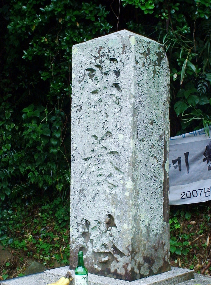 시바타 씨의 안내를 받아 산 너머 풀숲을 한참 헤치고 들어간 산 속에 공양탑(供養塔)이 서 있었습니다. 군함도에 있던 사찰에 안치되어 있던 조선인 희생자의 유골들이 옮겨져 이 탑 밑에 묻혔습니다.