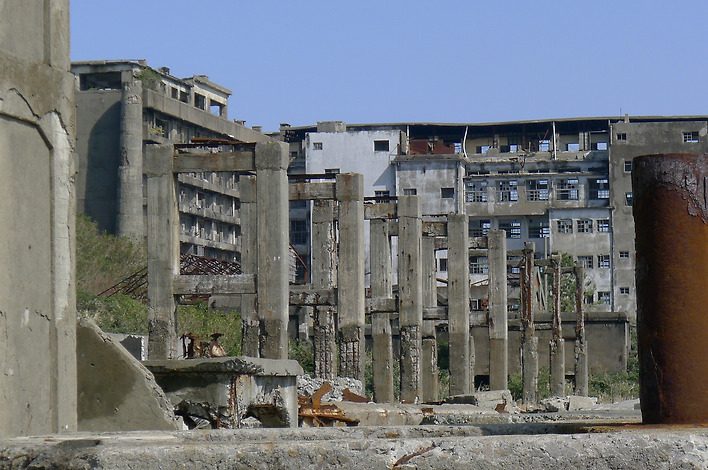 하시마의 좁은 땅을 최대한으로 이용하기 위해 1916년 일본 최초의 철근콘크리트 건물인 7층 아파트가 이곳에 세워졌습니다. 그 뒤로도 10층 아파트를 비롯하여 고층건물들이 계속 지어졌고 좁은 섬에 근대식 아파트가 빽빽이 들어선 모습이 마치 군함처럼 보여 그 때부터 ‘군함도’라고 불렸다고 합니다.