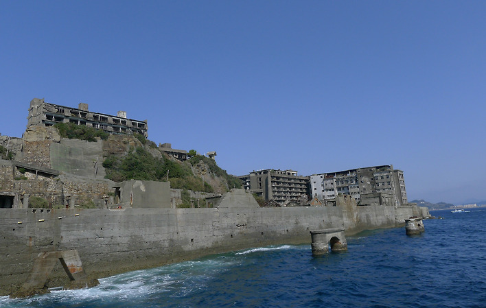 군수산업의 상징 나가사키 조선소가 양쪽 해안으로 펼쳐져 있는 바다를 벗어나 군함도로 향했습니다. 1974년 1월 탄광이 문을 닫아 이제는 아무도 살지 않는 섬입니다. 2008년에 제가 군함도를 찾았을 때는 섬에 상륙하는 것이 금지되어 있었기 때문에 작은 배로 군함도 주위를 둘러볼 수밖에 없었습니다.