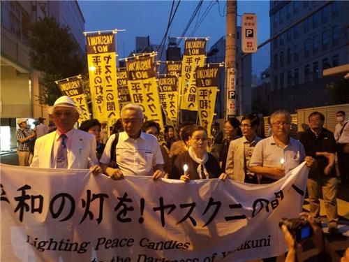 ‘평화의 촛불을! 야스쿠니의 어둠에’라는 주제인 이날 시위에 참가한 한국과 일본인 수백명은 ‘야스쿠니 반대’, ‘전쟁 반대’, ‘평화를 지키자’ 등의 구호를 외쳤다.