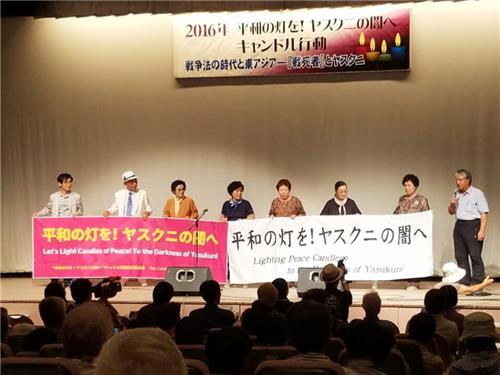 (도쿄=연합뉴스) 김정선 특파원 = 한국과 일본의 시민단체가 일본의 패전 71주년을 앞두고 일본 도쿄에서 야스쿠니(靖國) 신사에 반대하고 평화를 촉구하는 시위를 했다.