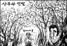 ▲ ‘일본군 위안부 피해자’ 전시회에 걸린 탁영호의 만화 ‘꽃반지’ 위안부 문제에 대한 일본의 공식적인 사죄와 법적 배상을 요구하며 매 주 수요일마다 이어지고 있는 수요 집회가 1천회를 맞은 날, 그 곳에 평화의 소녀상이 세워졌다. 이 책은 소녀상의 이야기를 아이들이 좀 더 이해하기 쉬운 만화를 통해 풀어내며, 일본 제국주의에 의해 일본군 위안부로 끌려간 꽃다운 소녀들의 아픔과 슬픔을 그리고 있다. 만화 ‘꽃반지’의 원화는 민족미술협의회에 주최했던 ‘일본군 위안부와 조선의 소녀들’과 지난 1월 30일부터 2월2일까지 프랑스 앙굴렘에서 열린 ‘2014알굴렘 국제 만화축제 ‘일본군 위안부 피해자’ 전시회에 출품돼 많은 사람들의 가슴을 울린 작품이다. 만화는 일본 대사관 앞 소녀상 둘레에 사람들이 모여 시위를 하고 있는 모습으로 시작된다. 해가 저물고 시위하던 사람들이 모두 자리를 떠나자 소녀상이 기지개를 켜고 일어나 누군가를 반갑게 맞이하러 뛰어간다. 소녀를 맞이한 이는 주름이 짙은 할머니. 웃으며 소녀를 맞이한 할머니는 순간 영정 사진으로 변한다. 장면이 바뀌며 한 남성이 전화 통화를 하고 있다. 그는 연고자가 없는 할머니의 사후처리 중인 구청 직원이다. 할머니의 몇 가지 되지 않는 유품 속에 구리로 만든 꽃반지 하나가 자리하고 있다. 장면은 구리 반지 속 꽃 문양 속으로 빨려들어 반지에 얽힌 슬픈 사연으로 이어진다. 비극적인 분위기를 효과적으로 드러내는 원화의 색감과 질감은 두 소녀가 겪은 불안과 괴로움의 감성을 잘 담아내 감동을 더한다. 책은 만화와